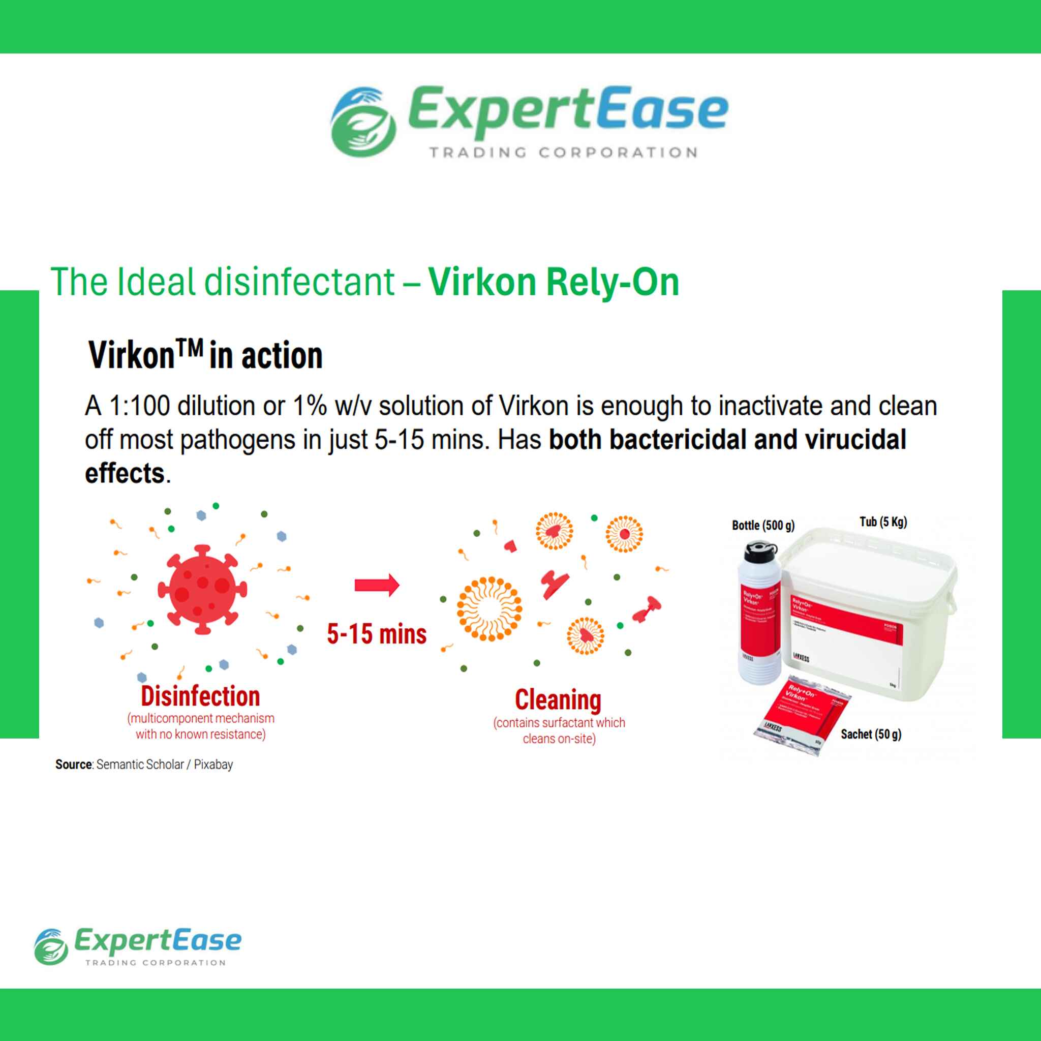 The Ideal disinfectant – Virkon Rely-On VirkonTM in action Source: Semantic Scholar / Pixabay A 1:100 dilution or 1% w/v solution of Virkon is enough to inactivate and clean off most pathogens in just 5-15 mins. Has both bactericidal and virucidal effects.