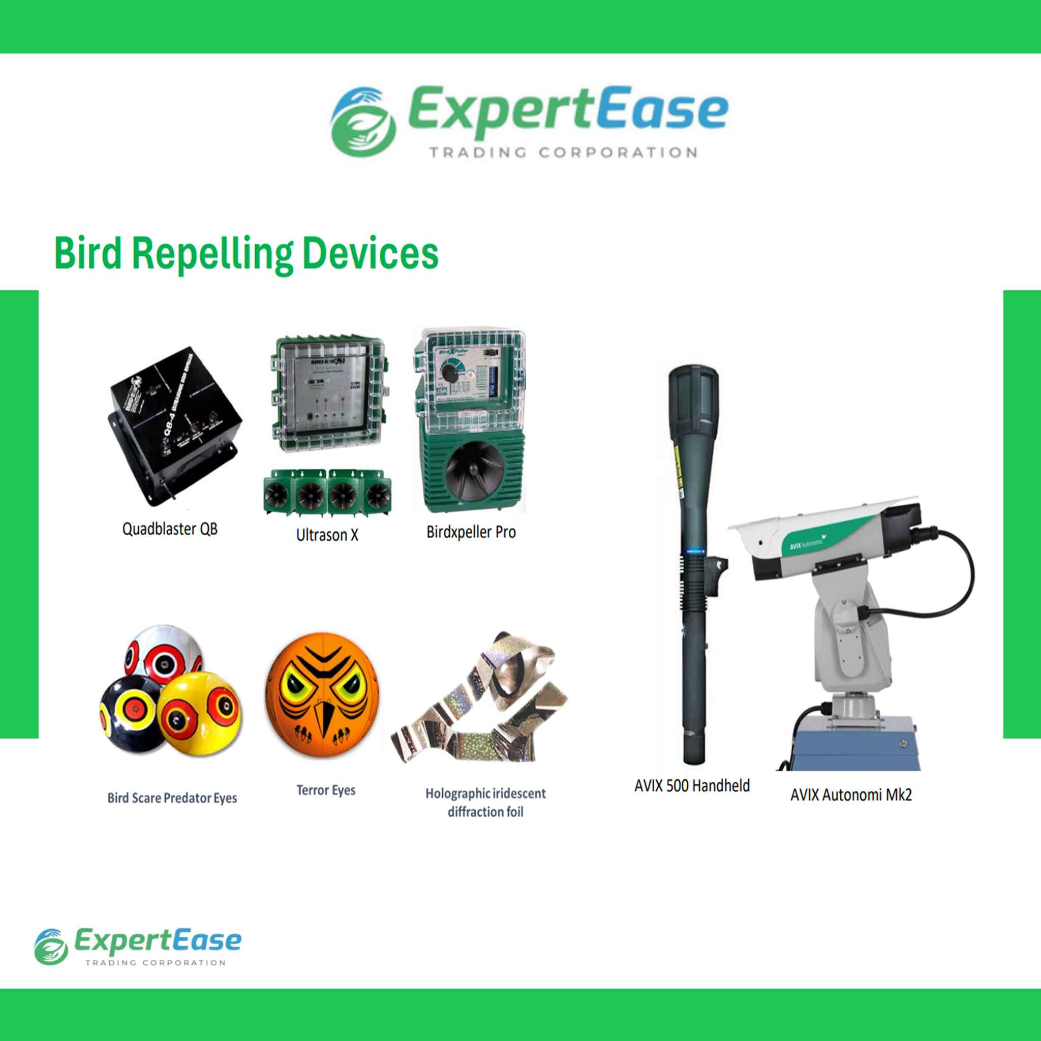 1. Quadblaster QB 2. Ultrason X 3. Birdxpeller Pro 4. Bird Scare Predator Eyes 5. Terror Eyes 6. Holographic iridescent diffraction foil 7. AVIX 500 handheld 8. AVIX Autonomi Mk2