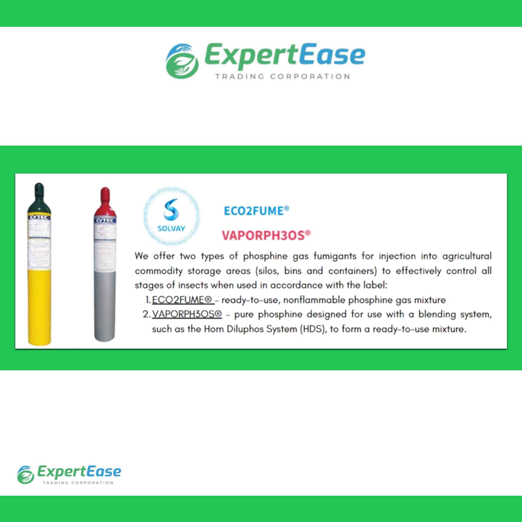 • Eco2Fume – 2% Phosphine • Vaporph3os – 99% Phosphine We offer two types of phosphine gas fumigants for injection into agricultural commodity storage areas (silos, bins and containers) to effectively control all stages of insects when used in accordance with the label: 1. ECO2FUME - ready-to-use, nonflammable phosphine gas mixture 2.VAPORPH3OS - pure phosphine designed for use with a blending system, such as the Horn Diluphos System (HDS), to form a ready-to-use mixture.