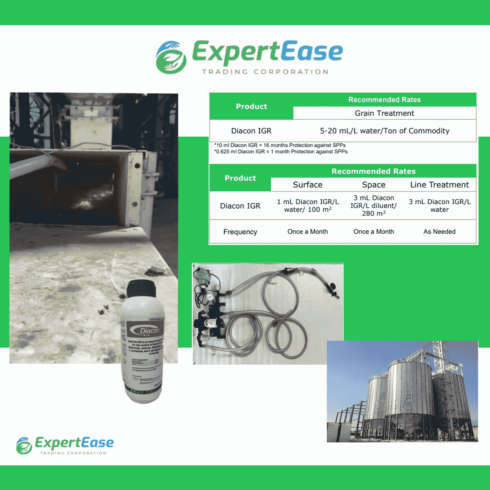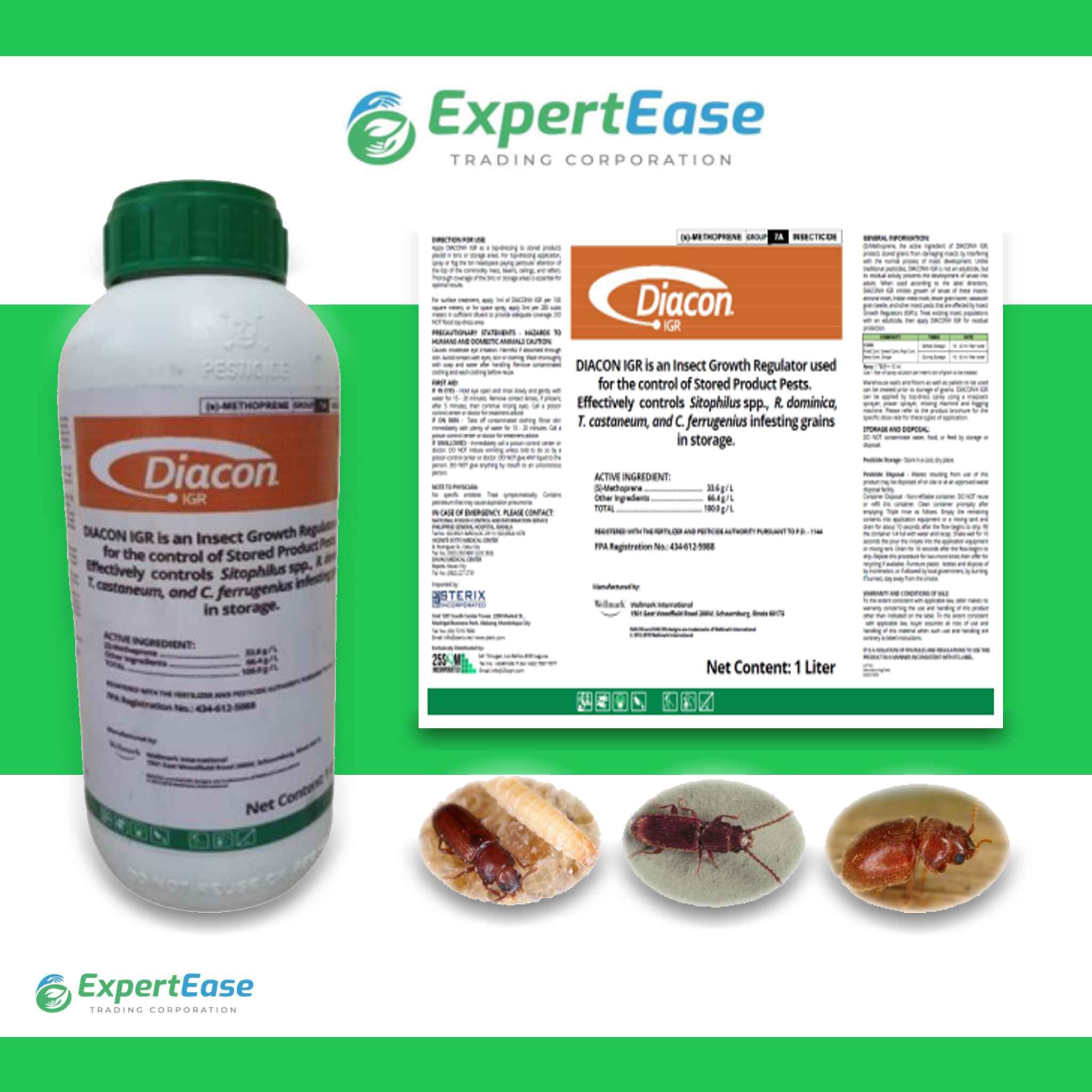 Diacon IGR– 33.6% (S)-Methoprene can be applied directly on the grains before storage and can also be used for structural and space treatment of silos, warehouses, process lines, machinery, and finished good stocks against stored product insect pests. (S)-Methoprene disrupts the life cycle of the insect preventing them from becoming adults that mate and reproduce. This is partnered with an adulticide to kill the adult stages that already exist in the grain.