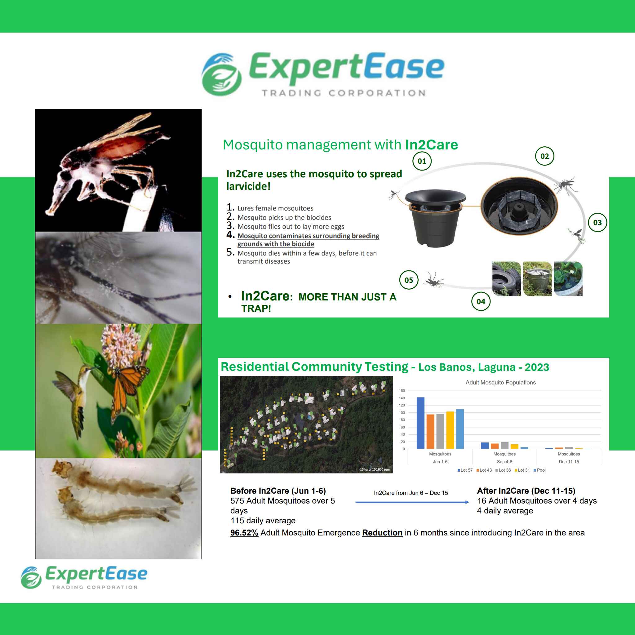 Mosquito management with In2Care Multi-impact mosquito control tool that uses mosquitoes to spread larvicides via Auto-dissemination • 74.03% Pyriproxyfen – Larvicide • 10% Beauveria bassiana - Adulticide In2Care uses the mosquito to spread larvicide! 1. Lures female mosquitoes 2. Mosquito picks up the biocides 3. Mosquito flies out to lay more eggs 4. Mosquito contaminates surrounding breeding grounds with the biocide 5. Mosquito dies within a few days, before it can transmit diseases Residential Community Testing - Los Banos, Laguna - 2023