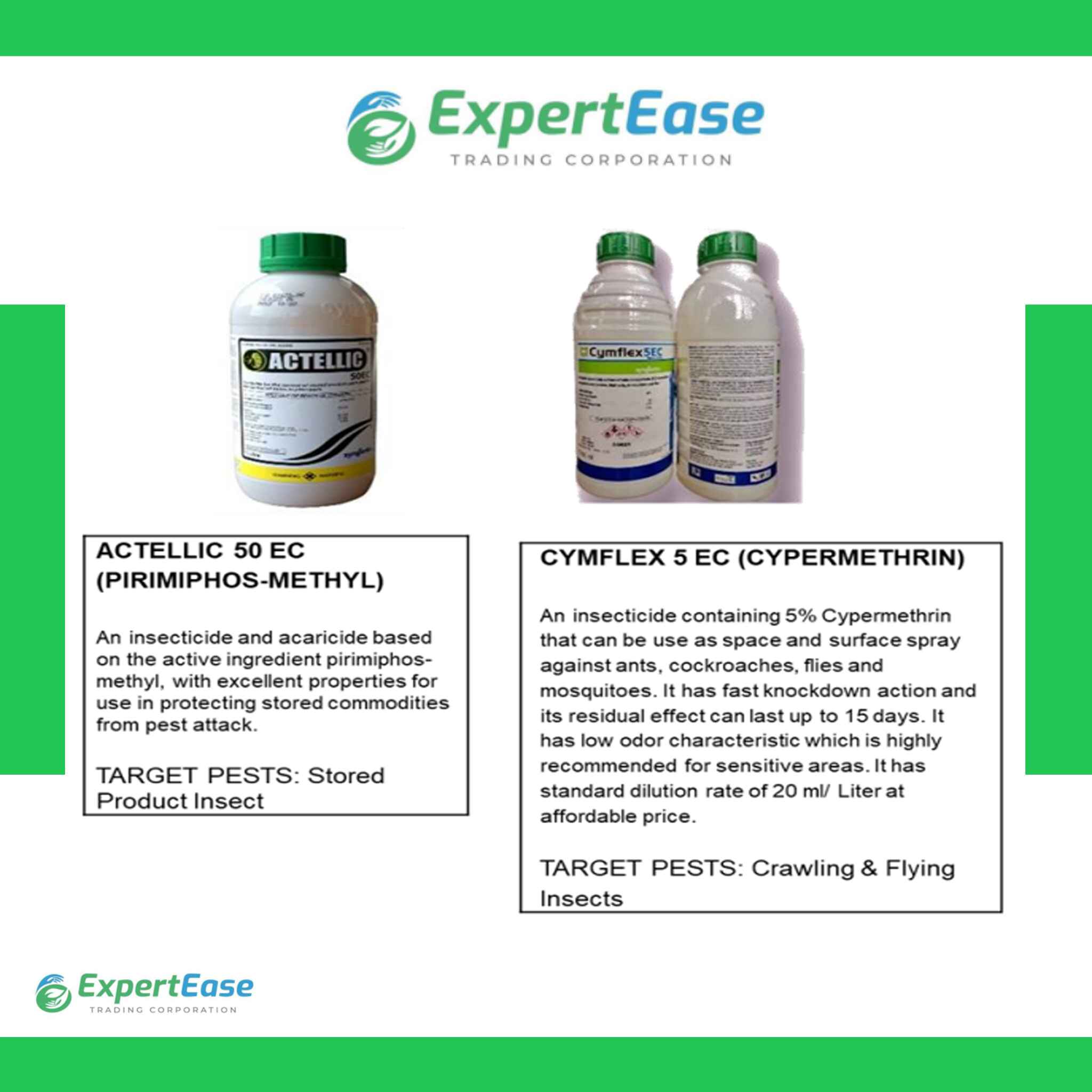 Actellic 50 EC (PIRIMIPHOS-METHYL) An insecticide and acaricide based on the active ingredient pirimiphosmethyl, with excellent properties for use in protecting stored commodities from pest attack. TARGET PESTS: Stored Product Insect CYMFLEX 5 EC (CYPERMETHRIN) An insecticide containing 5% Cypermethrin that can be use as space and surface spray against ants, cockroaches, files and mosquitoes. It has fast knockdown action and its residual affect can last up to 15 days. It has low odor characteristic which is highly recommended for sensitive areas. It has standard dilution rate of 20 ml/ Liter at affordable price. TARGET PESTS: Crawling & Flying Insects