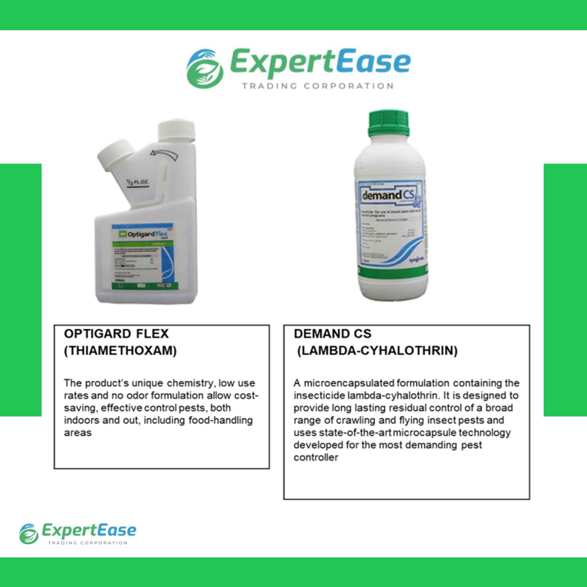 OPTIGARD FLEX (THIAMETHOXAM) The product's unique chemistry, low use rates and no odor formulation allow cost-saving, effective control pests, both indoors and out, including food-handling areas. DEMAND CS (LAMBDA- CYHALOTHRIN) A microencapsulated formulation containing the insecticide lambda-cyhalothrin. It is designed to provide long lasting residual control of a broad uses state-of-the-art microcapsule technology developed for the most demanding pest controller.